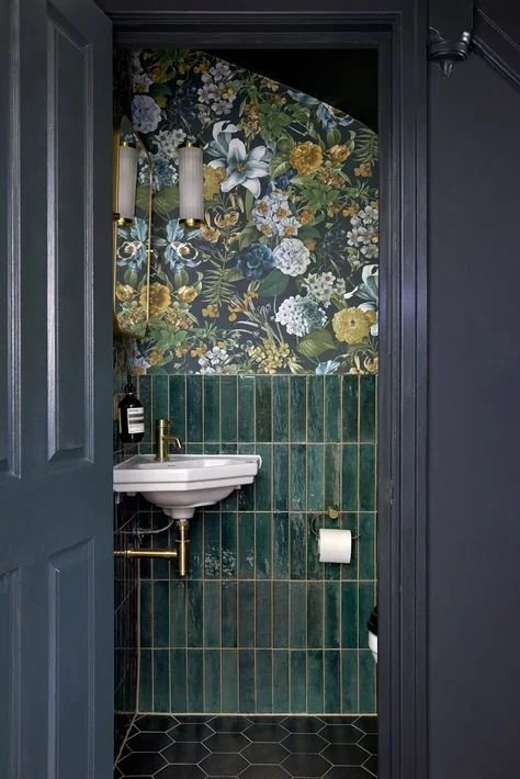 In a small powder room, layering different textures can make a huge impact. Contrast matte and glossy finishes—think glossy tiles on the floor paired with matte wall tiles, or a sleek, high-gloss paint against a rougher, textured wallpaper. You can also play with the texture of the wallpaper itself, choosing designs that combine pattern and depth for added interest. Metal details, like a brushed gold or antique brass faucet, can add a touch of elegance.